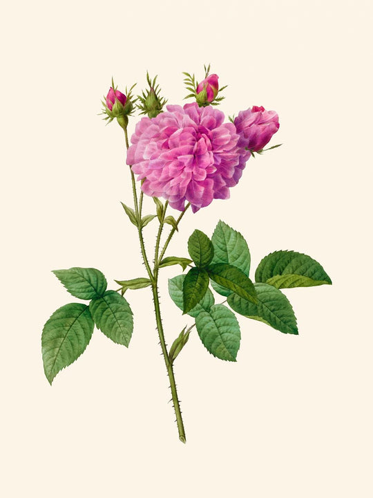 Incorporating the sophisticated designs and soft hues, this print is more than just an artwork; it's a glimpse into the beauty and elegance of the early 19th century botanicals. The Rosa gallica, known for its fragrance and layered petals, is artfully depicted with a timeless charm, making it a perfect addition to both traditional and contemporary interiors.