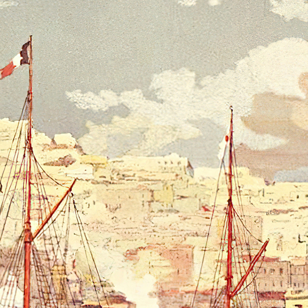 Color and design are masterfully orchestrated. A dominant field of serene blue water and sky is balanced by warm beige architecture and the red accents of funnel, pennant, and buoy—small yet decisive notes that pull the eye through the composition. The ship’s dark hull anchors the scene, while delicate cloud forms and the lively gulls add movement. It’s an elegant blend of crisp maritime geometry and atmospheric Mediterranean light, making this print a striking focal point in coastal, nautical, or travel‑inspired interiors.