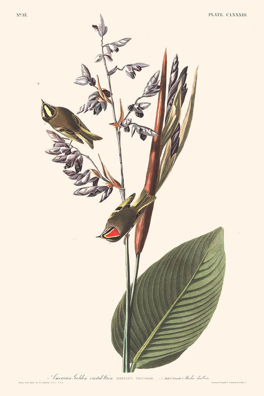 American Golden crested-Wren (Plate 183) by John James Audubon, first published in 1827, is a captivating illustration from one of the most significant ornithological works, Audubon’s The Birds of America. This enchanting depiction showcases the vibrancy and detailed beauty of the American Golden crested-Wren in its natural habitat.