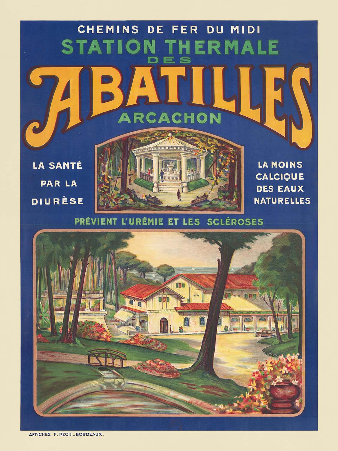 Why this poster matters: Arcachon was one of the great health and leisure resorts of the early 20th century, famed for pine forests, sea air, and mineral springs. The Abatilles quarter became synonymous with hydrotherapy and restorative walks beneath towering pines. The text woven into the design underscores the era’s medical promises: “La santé par la diurèse,” “La moins calcique des eaux naturelles,” and “Prévient l’urémie et les scléroses”—capturing the persuasive voice of railway advertising that encouraged elegant escape via the Chemins de Fer du Midi.
