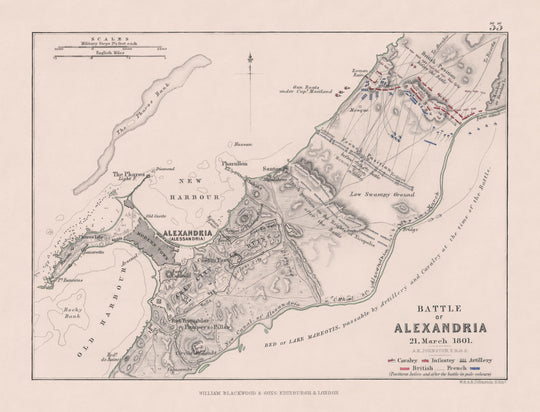 The artist behind this map, W. & A.K. Johnston, was renowned for their detailed and accurate cartographic work in the late 18th and early 19th centuries. The vivid depiction of military movements in the Battle of Alexandria stands testament to their mastery. This lithograph is particularly notable for mapping out the British and French military strategies, including cavalry, infantry, and artillery, which were meticulously colour-coded to indicate positions before and after the clash.