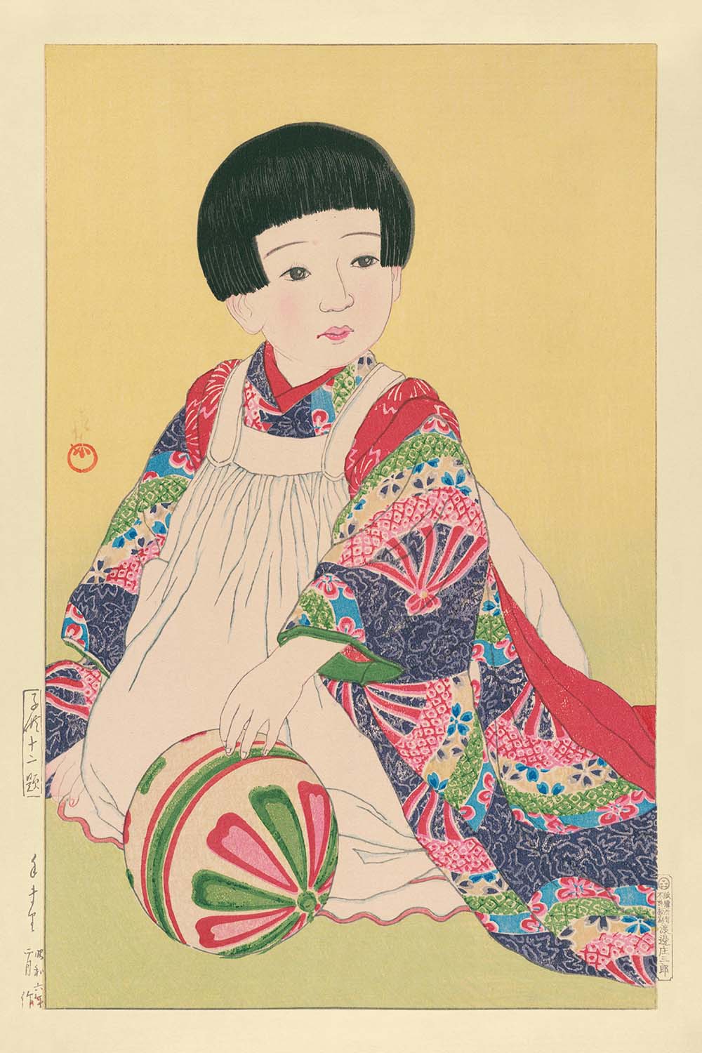 Hasui Kawase, a notable artist within the 20th-century Japanese art scene, remains revered for his ethereal landscapes and serene portrayals of everyday life. His works adeptly blend traditional Japanese aesthetics with the emerging influences of Western art during his time. "Child with Ball" is notable for its soothing use of earthy tones, primarily yellow and beige, and the way it invokes a sense of peace and nostalgic reflection.