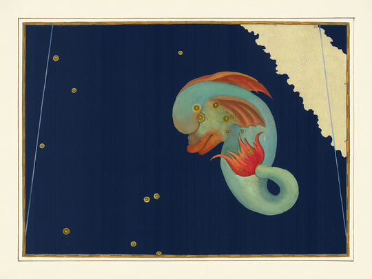 "Delphinus," masterfully created by Johann Bayer in 1603, is a remarkable handcoloured old star chart. This striking celestial chart of Delphinus, the dolphin constellation, is notable for its rich hand-colouring and stars heightened in gold. Nestled in the northern sky near the celestial equator, Delphinus has been recognized since the 2nd century by astronomer Ptolemy and remains one of the 88 modern constellations acknowledged today by the International Astronomical Union.