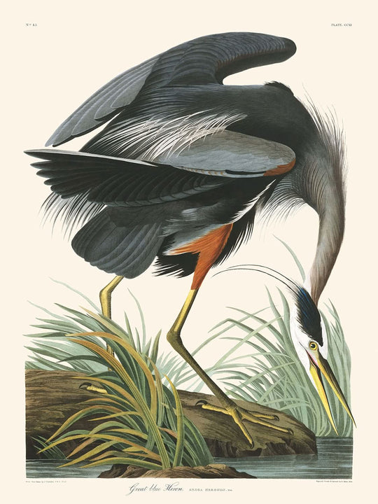 The Great Blue Heron illustration stands out for its serene yet dynamic composition. Audubon’s sophisticated use of color—to depict the subtle blues and greys of the Heron's plumage against natural backdrops—draws the viewer into a peaceful moment by a water’s edge. Owning this print not only brings beauty into a space but also a slice of ornithological history, celebrated by art lovers and naturalists alike.