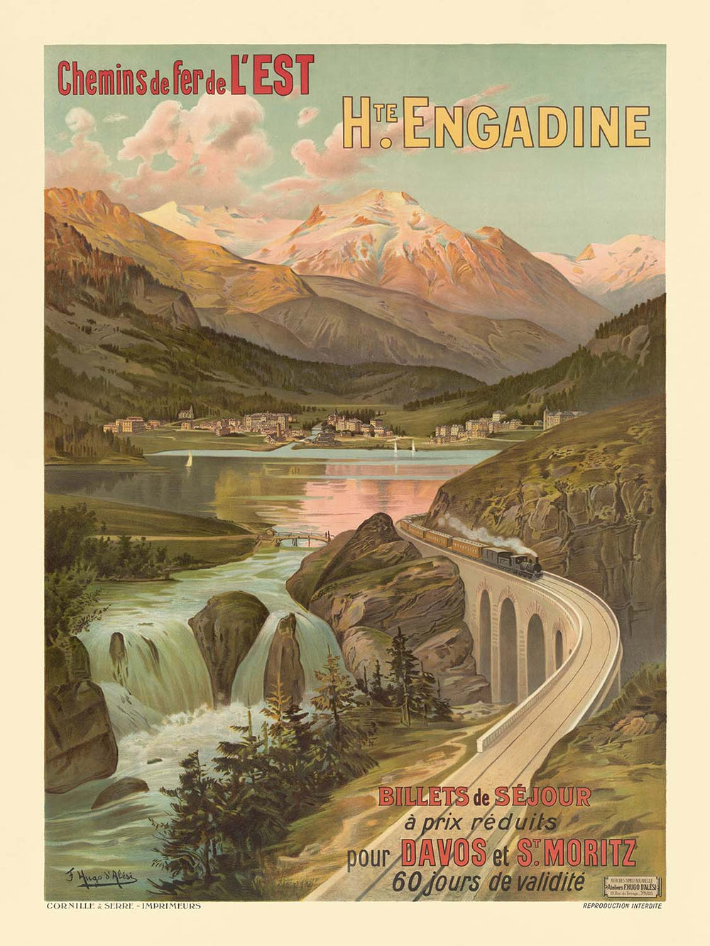 Chemins de fer de l’Est Haute Engadine by Frederic Hugo d’Alési (1910) evokes the golden age of Alpine tourism, inviting travelers from the French Eastern Railway into Switzerland’s sunlit Upper Engadine. This high valley in the canton of Graubünden—home to St. Moritz, Sils, and Silvaplana—was famed for bracing air, crystalline lakes, and grand hotels, all of which are captured in the poster’s panoramic sweep. The composition revels in a classic Belle Époque optimism: cool alpine greens and glacial blues balance against earthy browns, and the scenery opens outward toward distant, snow-bright summits and luminous lake water below.