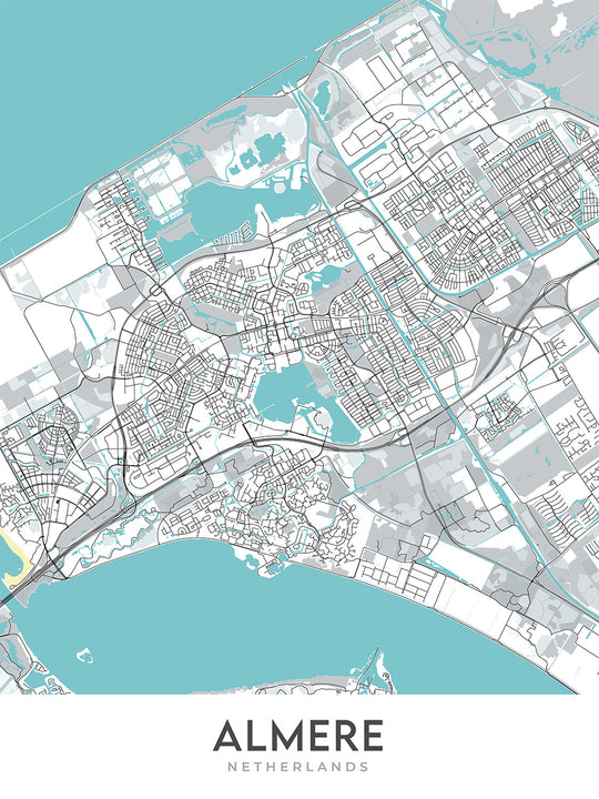 This map of Almere, Netherlands, is a modern and detailed cartographic artwork that will be a stylish addition to your home décor. The map focuses on the city of Almere and the larger region of Netherlands, and is designed to be a beautiful and informative piece of art. The map covers a wide range of neighborhoods, including Almere Stad, Almere Buiten, Almere Haven, Almere Poort, Almere Hout, Almere Pampus, Almere Overgooi, Almere Seepark, Almere Muziekwijk, Almere Filmwijk, Almere Sportwijk, Almere Nobelwijk, Almere Waterwijk, Almere Danswijk, Almere Literatuurwijk, Almere Kunstwijk, Almere Architectenwijk, Almere Stedenwijk, Almere Regenboogwijk, and Almere Duin.