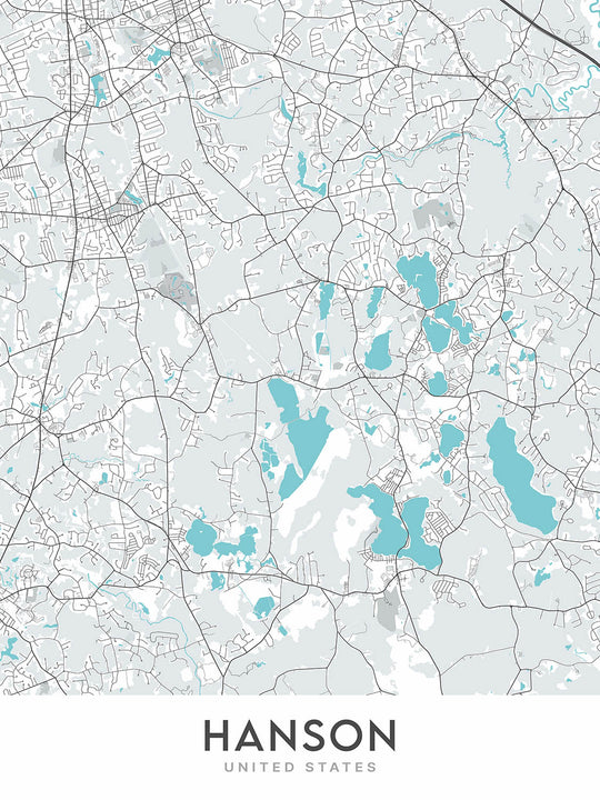 This map of Hanson, Massachusetts, is a modern, detailed street map without labels. It focuses on the city center and the surrounding areas, providing a comprehensive overview of the city's layout and geography. The map covers a significant portion of Hanson, including several neighborhoods, landmarks, and major roads.