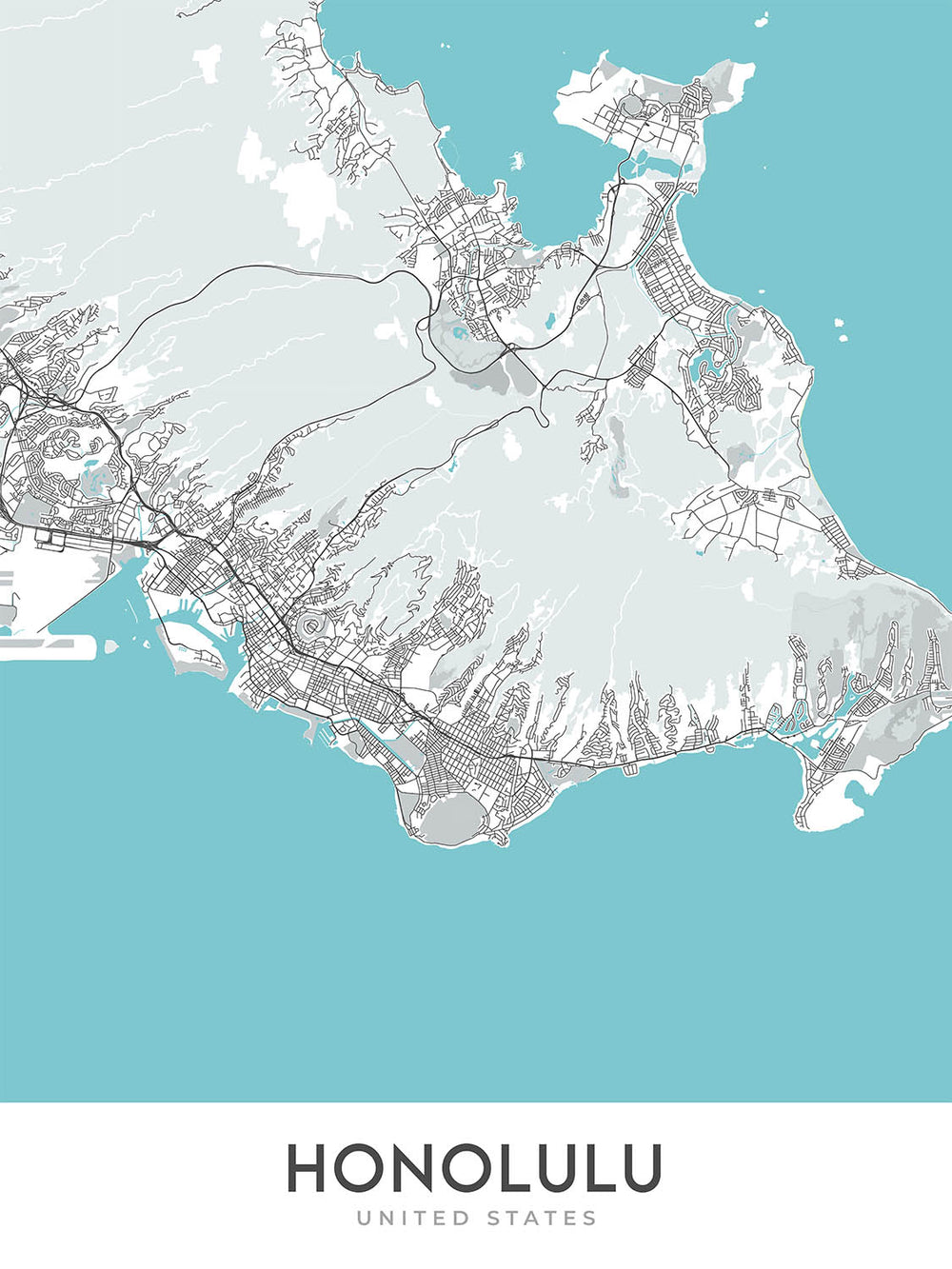 Modern City Map of Honolulu, HI: Waikiki, Diamond Head, Downtown, Ala Moana, University of Hawaii
