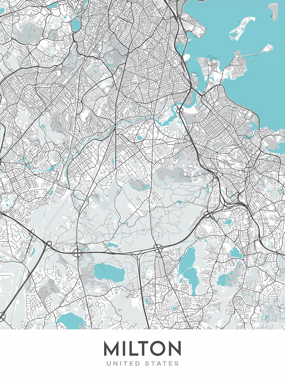 Modern City Map of Milton, MA: Blue Hills Reservation, Cunningham Park, Houghton's Pond, Chickatawbut Hill, Blue Hill Avenue