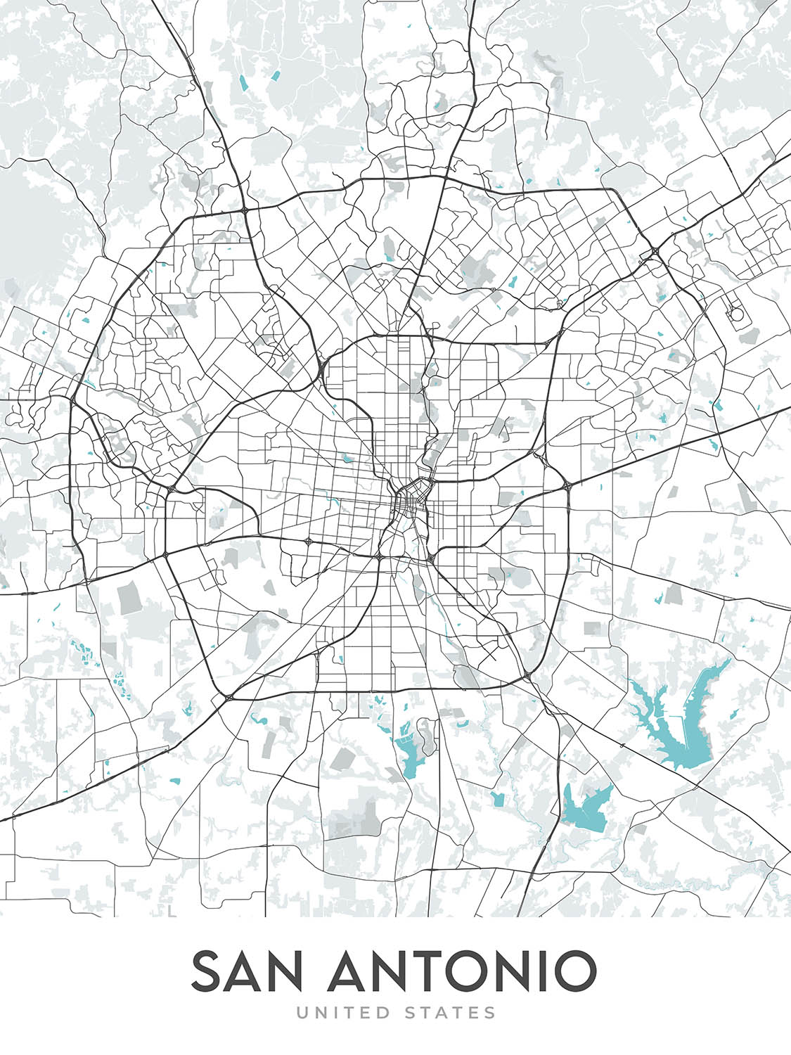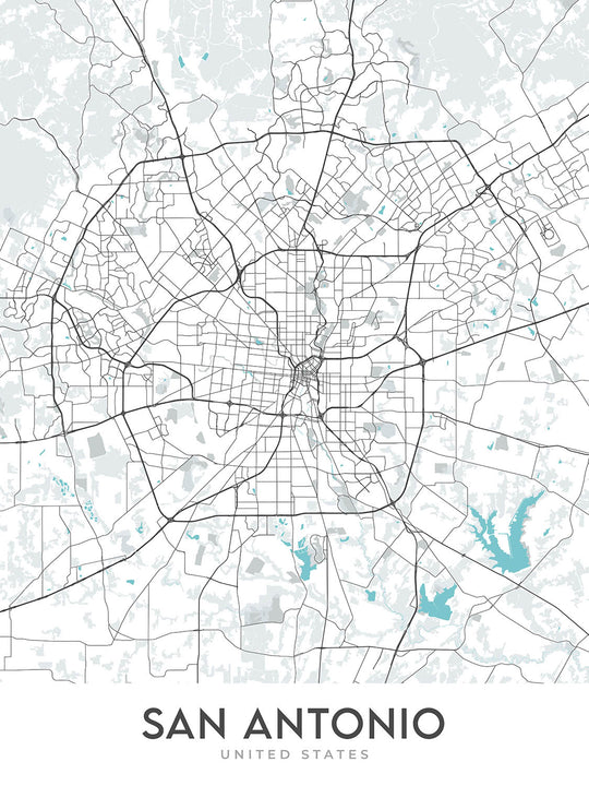 This map of San Antonio, Texas, is a modern, detailed street map without labels. The map covers a rectangular area that extends approximately 52 miles from top to bottom and 44 miles from left to right. The city of San Antonio is located in the south-central part of Texas and is the seventh-most populous city in the United States. The map focuses on the urban area of San Antonio and includes many of the city's most notable neighborhoods, landmarks, and thoroughfares.