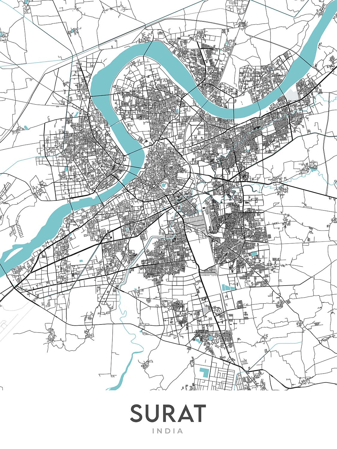 This map of Surat offers more than just geographic information; it is a statement piece that can elevate any room's decor. Its clean lines and elegant design make it an ideal focal point for living rooms, offices, or study areas. The map's monochromatic style ensures it complements a wide range of interior design themes, from minimalist to eclectic. By choosing this map, you're not just selecting a decorative item; you're bringing a piece of Surat's vibrant urban fabric into your home.