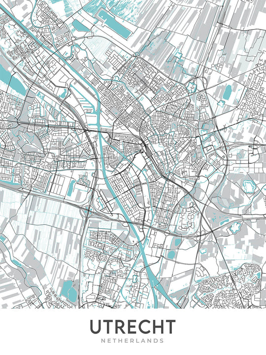 Modern City Map of Utrecht, Netherlands: Dom Tower, Centraal Station, Rietveld House, Botanical Gardens, Jaarbeurs
