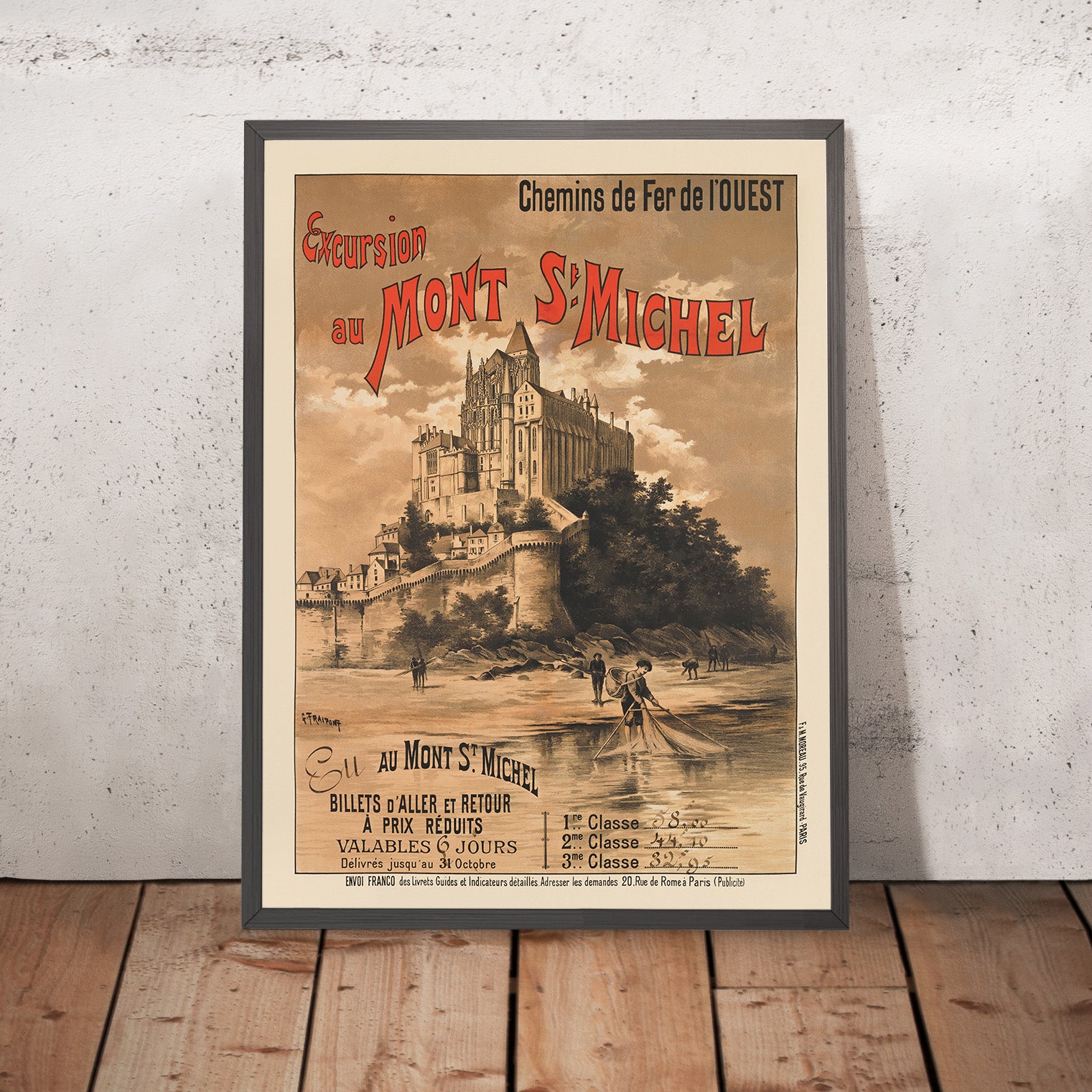 Design lovers will appreciate how Fraipont’s composition balances calm expanse and architectural drama. The broad plane of the tidal flats—rendered in layered beige and brown—slows the eye before it rises to the sculptural silhouette of the Mount, while the crisp red title type provides a period flourish and a lively counterpoint to the muted palette. The restrained colors make this piece unusually easy to live with; it pairs beautifully with neutral interiors, linen textures, natural woods, or coastal decor, and it brings a sophisticated French note to hallways, living rooms, and bedrooms alike.