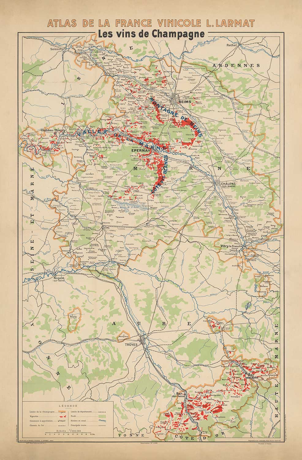 Old Champagne Vineyard Map, France, 1944 by Louis Larmat: Reims, Epernay, Troyes, Chatau-Thierry, Bar-Sur-Seine