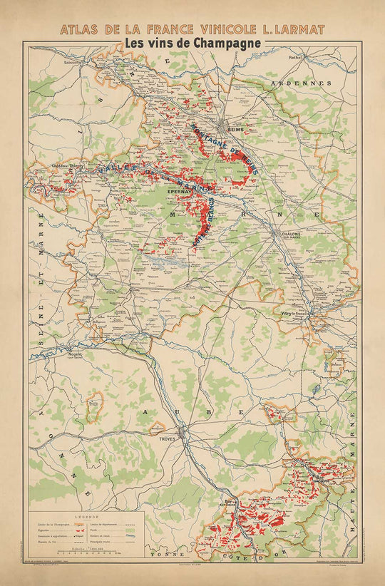 This wonderful old map of France's Champagne Vineyards was originally published in 1944. It was created by Louis Larmat.