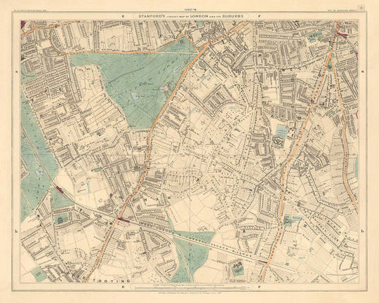 The map was originally published in 24 sheets. Altogether the map would've measured about 2 metres wide (78 inches). This here is sheet 18, which focuses on Clapham, Clapham Common and Balham in the London boroughs of Lambeth and Wandsworth.