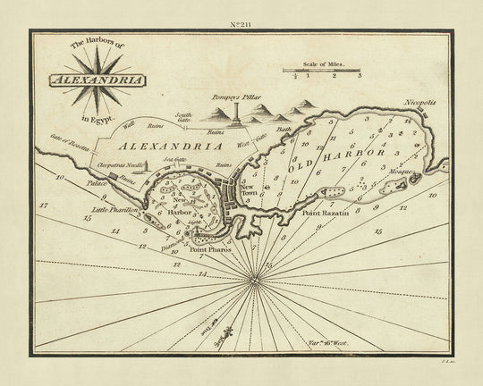 Moreover, the chart does not shy away from showcasing Alexandria's architectural heritage. It meticulously marks the locations of city walls, gates, and even the ancient streets, alongside notable ruins such as Pompey's Pillar, Cleopatra's Needle, and Nicopolis. These elements not only guide the mariner but also educate the historian, the archaeologist, and the curious traveler about the rich tapestry of historical narratives that Alexandria embodies.