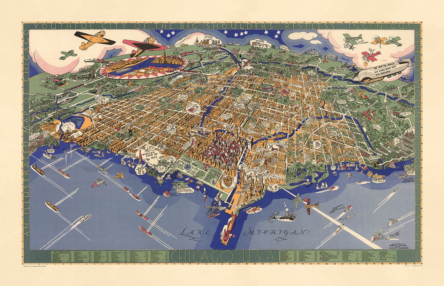 This strikingly beautiful and interesting birds eye map is one of the first and most accurate maps of modern Chicago. It was designed by Charles Turzak and Henry T. Chapman and published in 1931.