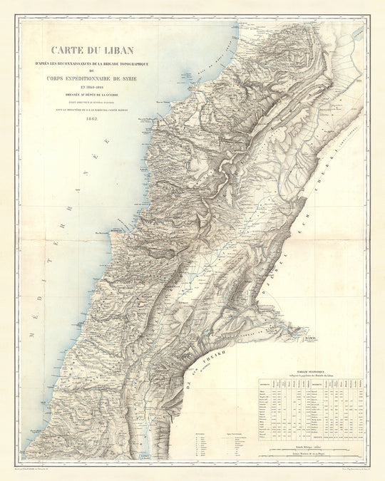 This is a detailed and fascinating old map of Lebanon, made by the French cartographic agency Depot de la Guerre in 1862. The map is based on surveys conducted by the French Topographic Brigade during the Syrian Expedition of 1860-1861. It shows a large area of land, extending from the Mediterranean coast to the Anti-Lebanon Mountains. The map is also notable for its depiction of the various religious communities that lived in Lebanon at the time, including Maronites, Druze, Sunnis, and Shiites.