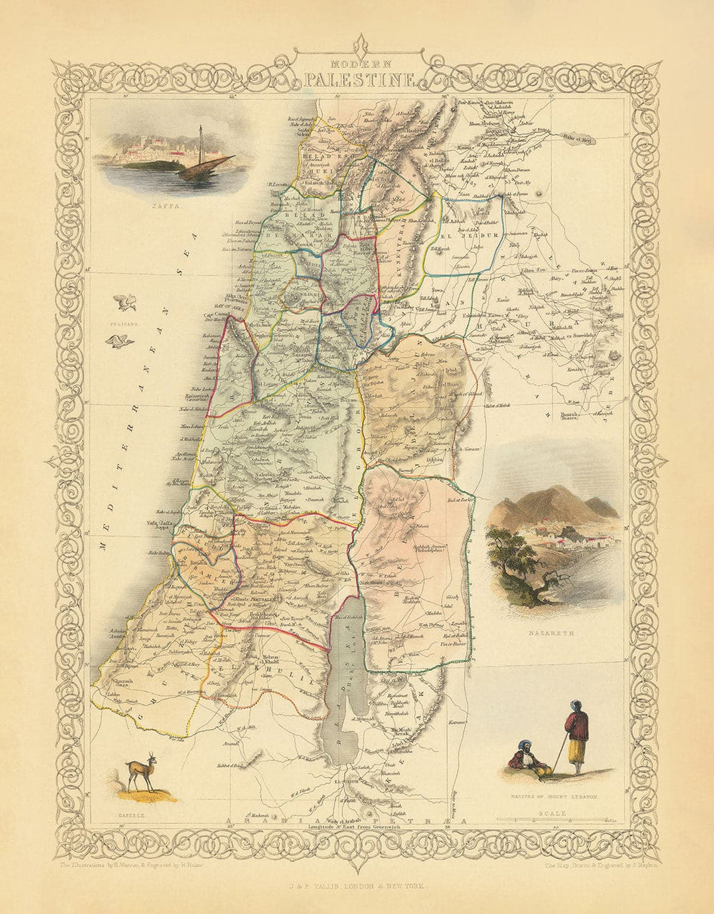Around the edges of the map are detailed, wonderfully handcoloured engravings of important landmarks such as Nazareth, Jaffa, and a sketch of "the natives of Mount Lebanon" and a gazelle.