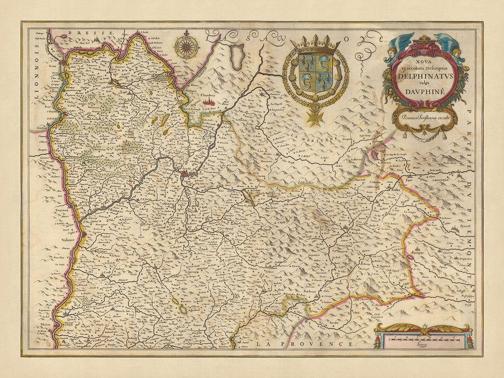 Immerse yourself in the grandeur of 17th century France with the stunning 'Nova et accurata Descriptio Delphinatus vulgo Dauphine', an intricately detailed map crafted by the renowned Nicolaes Visscher II. Translated into English, the title of this masterpiece is 'New and Accurate Description of Dauphiné', which was a province in southeastern France, now part of the modern Auvergne-Rhône-Alpes region. Visscher, a prominent figure in the Dutch Golden Age of cartography, has meticulously represented the political divisions of the time, providing a fascinating glimpse into the past.