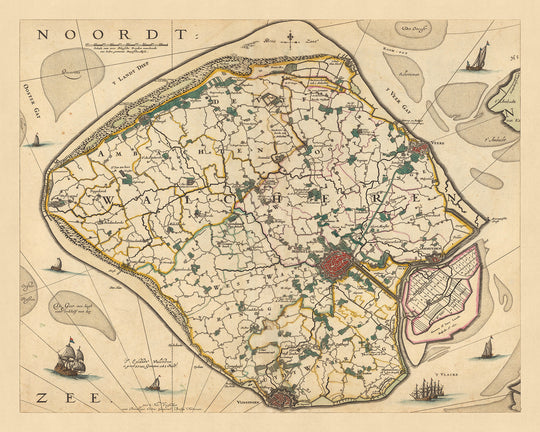 Veere, another city featured on the map, was a prosperous trading port in the Middle Ages, known for its Scottish wool trade. Lastly, Koudekerke is depicted, a small village on Walcheren Island, representing the quieter, rural life of the region. Each of these locations provides a glimpse into the diverse aspects of life in Zeeland during the late 17th century.