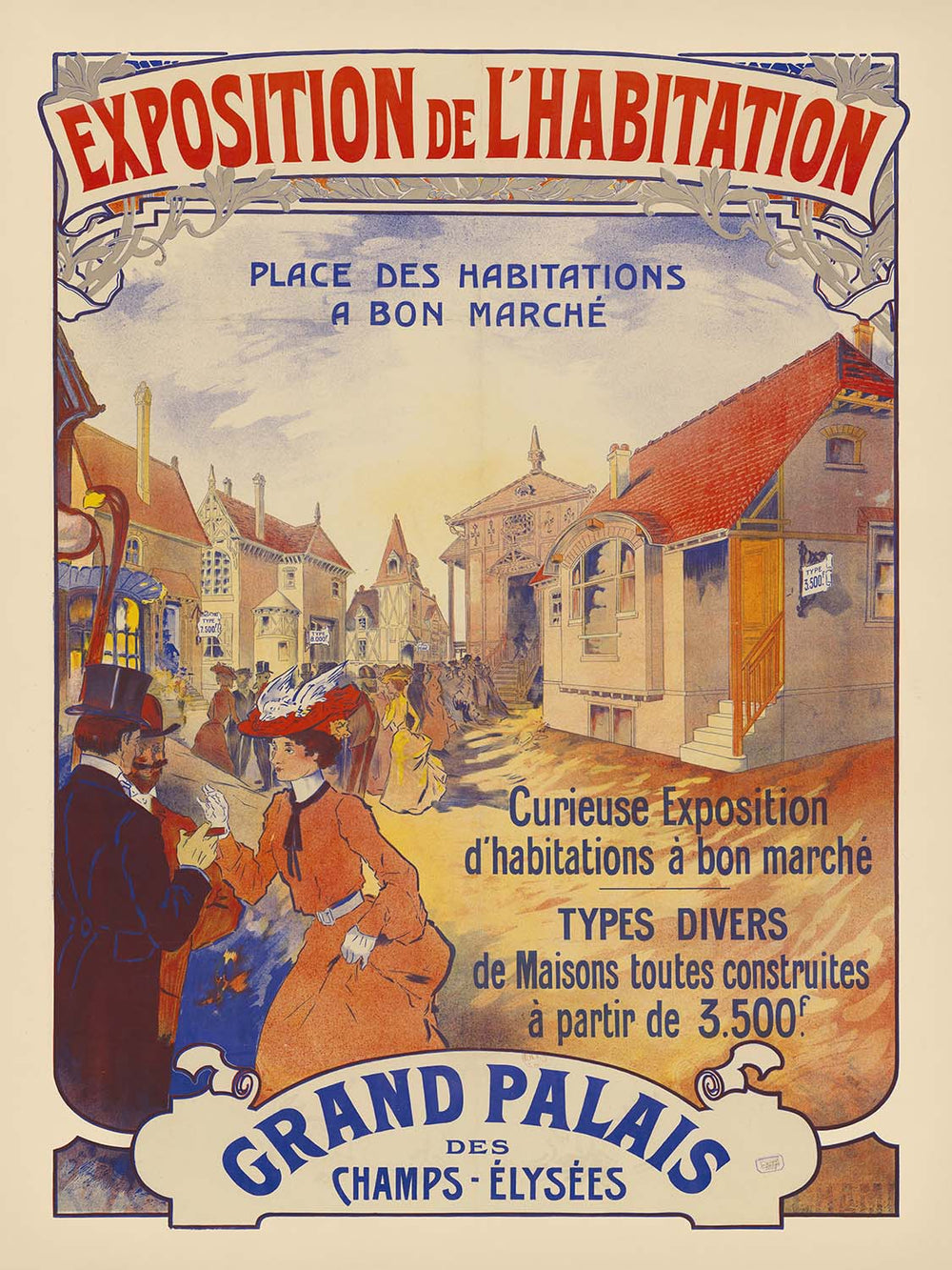 Exposition de l’habitation. curieuse exposition d’habitations à bon marché by Imp. Chaix (1903) captures the optimism and ingenuity of Belle Époque Paris, where art, industry, and daily life intertwined. Printed by the renowned Imprimerie Chaix of 20 Rue Bergère, the poster announces an exhibition devoted to affordable housing—an issue at the forefront of turn-of-the-century urban life. Its Art Nouveau spirit is unmistakable: flowing lines, animated figures in period dress, and a lively cityscape of imaginative dwellings that speak to both social progress and Paris’s love of elegant design.