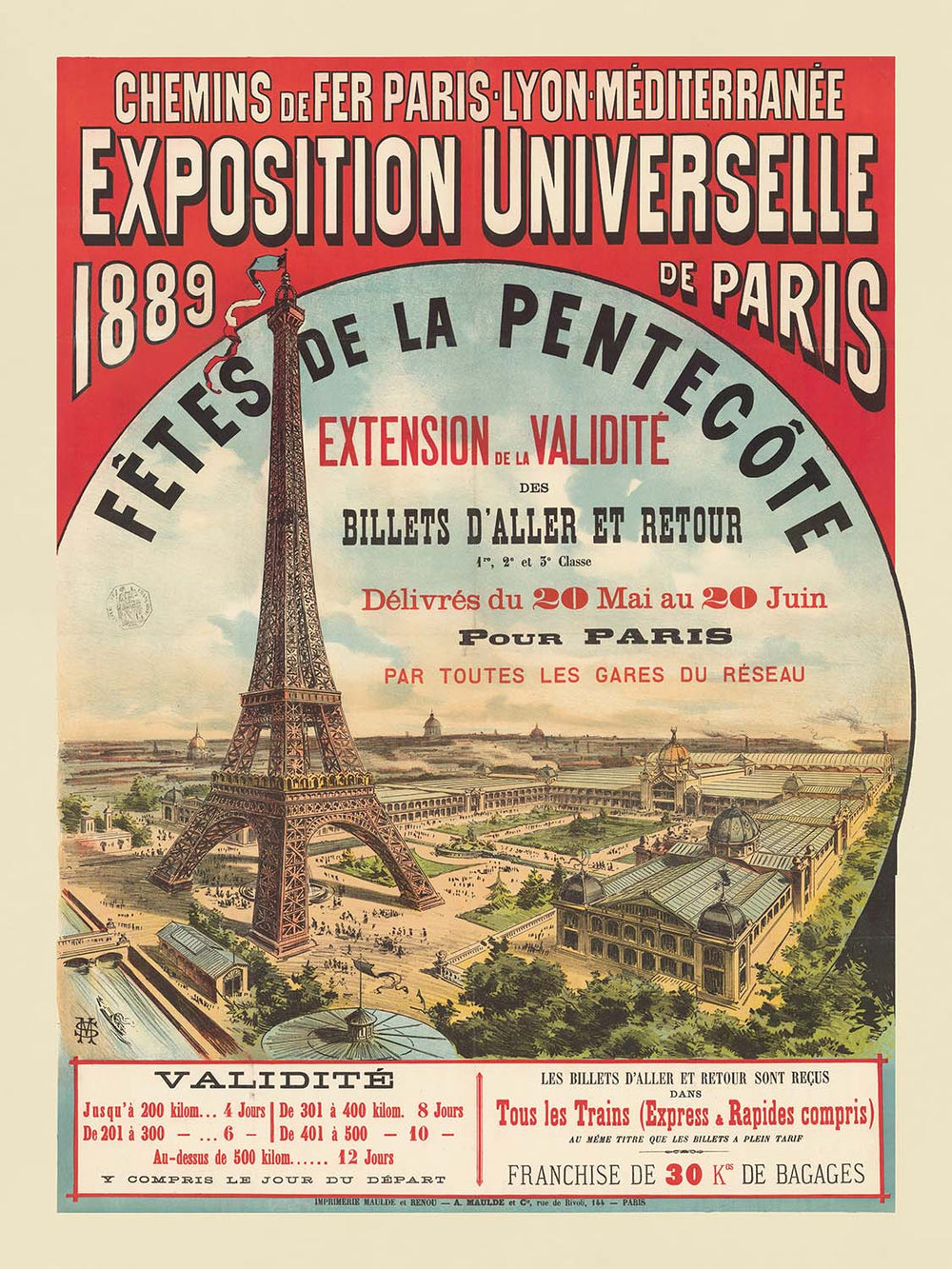 About the subject: The Paris–Lyon–Méditerranée (PLM) railway connected Paris with the Southeast, Lyon, the Alps, and the sunlit ports of the Mediterranean. For the Whitsun holidays of 1889, PLM offered extended‑validity return tickets to bring visitors to the Exposition Universelle. This was the fair that unveiled Gustave Eiffel’s iron marvel; the poster’s vantage across the Champ de Mars captures the modern spirit Paris projected to the world that summer.