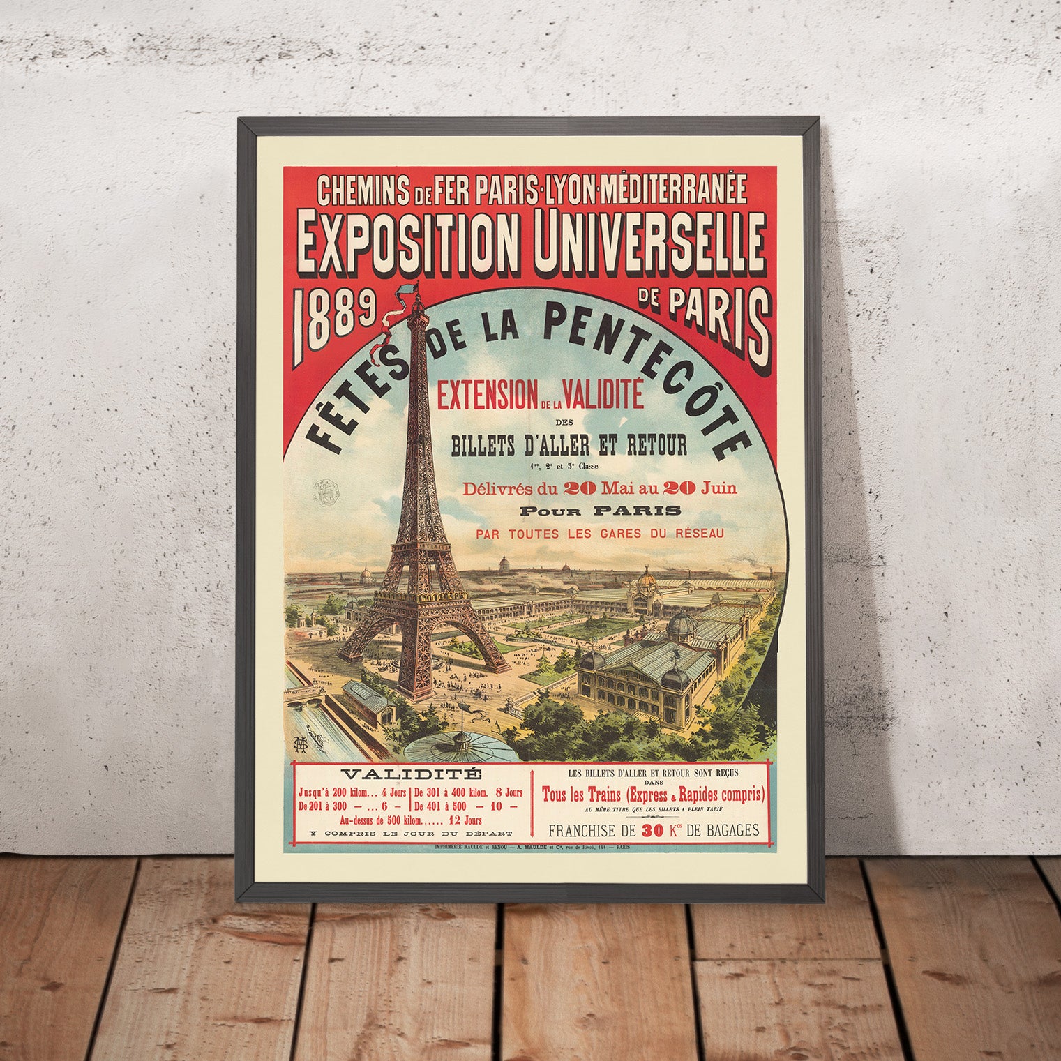 About the style: Rendered as a color lithograph, the composition balances spectacle and clarity. The beige ground and soft blue gradient give air and light to the scene, while the emphatic red header and black letterforms relay information with theatrical impact. The circular “window” of sky focuses the eye on the Eiffel Tower’s filigree ironwork, and the diagonal rail line animates the foreground—details that make this print both a historic document and a striking design object for contemporary interiors.