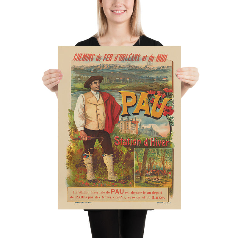 Design and color: This poster’s palette—verdant greens, warm browns, and punctuating reds—captures the contrast between evergreen gardens and alpine peaks. The heroic foreground figure, with broad beret, red cape, and sheepskin gaiters, anchors a composition that flows from lush foliage to distant blue ranges. Typographic drama—especially the oversized “PAU” intertwined with poppies—makes the piece a striking focal point in any room, whether styled with vintage travel decor or clean, contemporary frames.