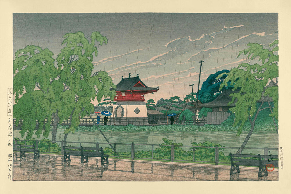 "Rain at Shinobazu Pond," a mesmerizing woodblock print crafted in 1935 by Hasui Kawase, captures the tranquil beauty of traditional Japanese landscapes. Hasui Kawase, a prominent figure in the Shin-Hanga movement, is revered for his revitalization of ukiyo-e woodblock printmaking, blending dynamic Western art influences with classic Japanese techniques.
