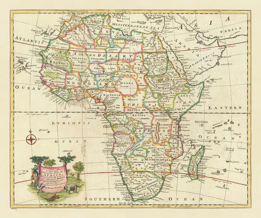 This fascinating, fantastically detailed and very rare map of Africa by British mapmaker Emanuel Bowen has significant historical value. It is shown here in its original, monochrome copperplate format.