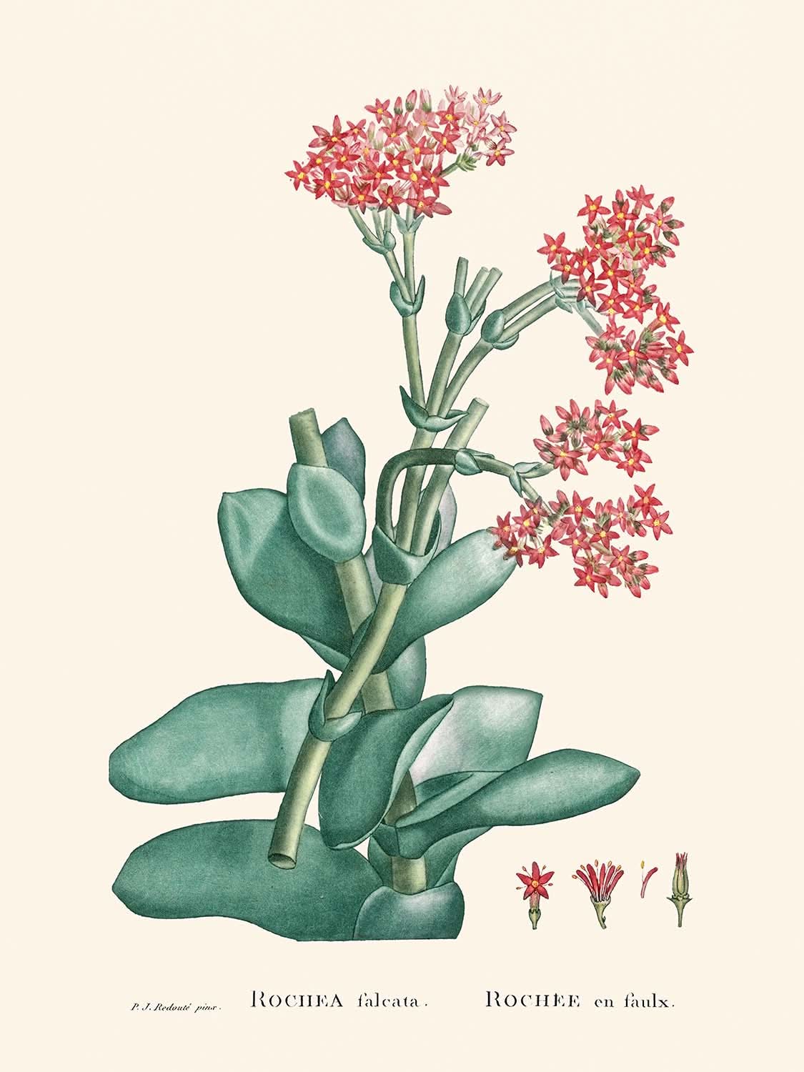 This print, characterized by its ethereal elegance, stands out for both its historical significance and aesthetic beauty. "Rochea Falcata" is not merely a depiction of the propeller plant; it represents Redouté's devotion to the vivid portrayal of nature's diversity. The captivating details in the structure and hue of the plant's leaves and petals invite viewers to explore a symphony of colors and textures that unite under Redouté's nuanced touch.