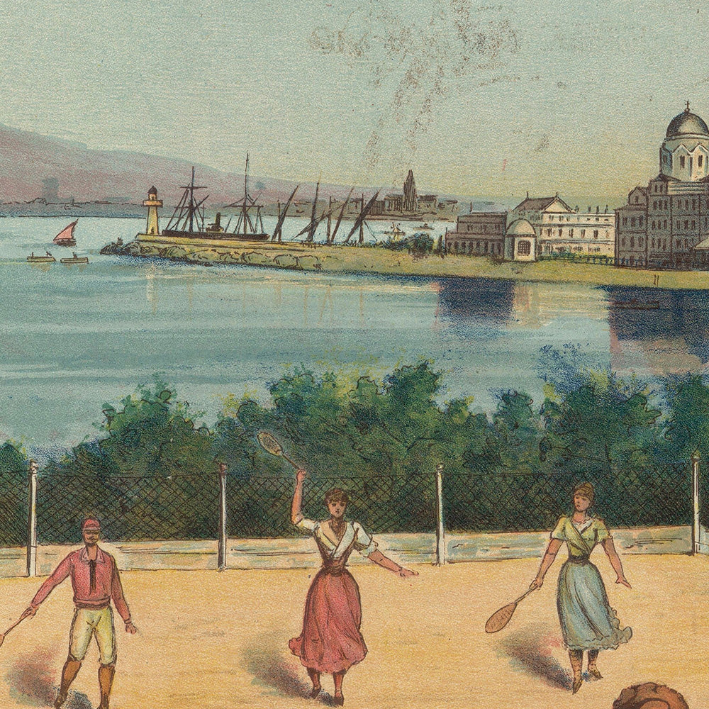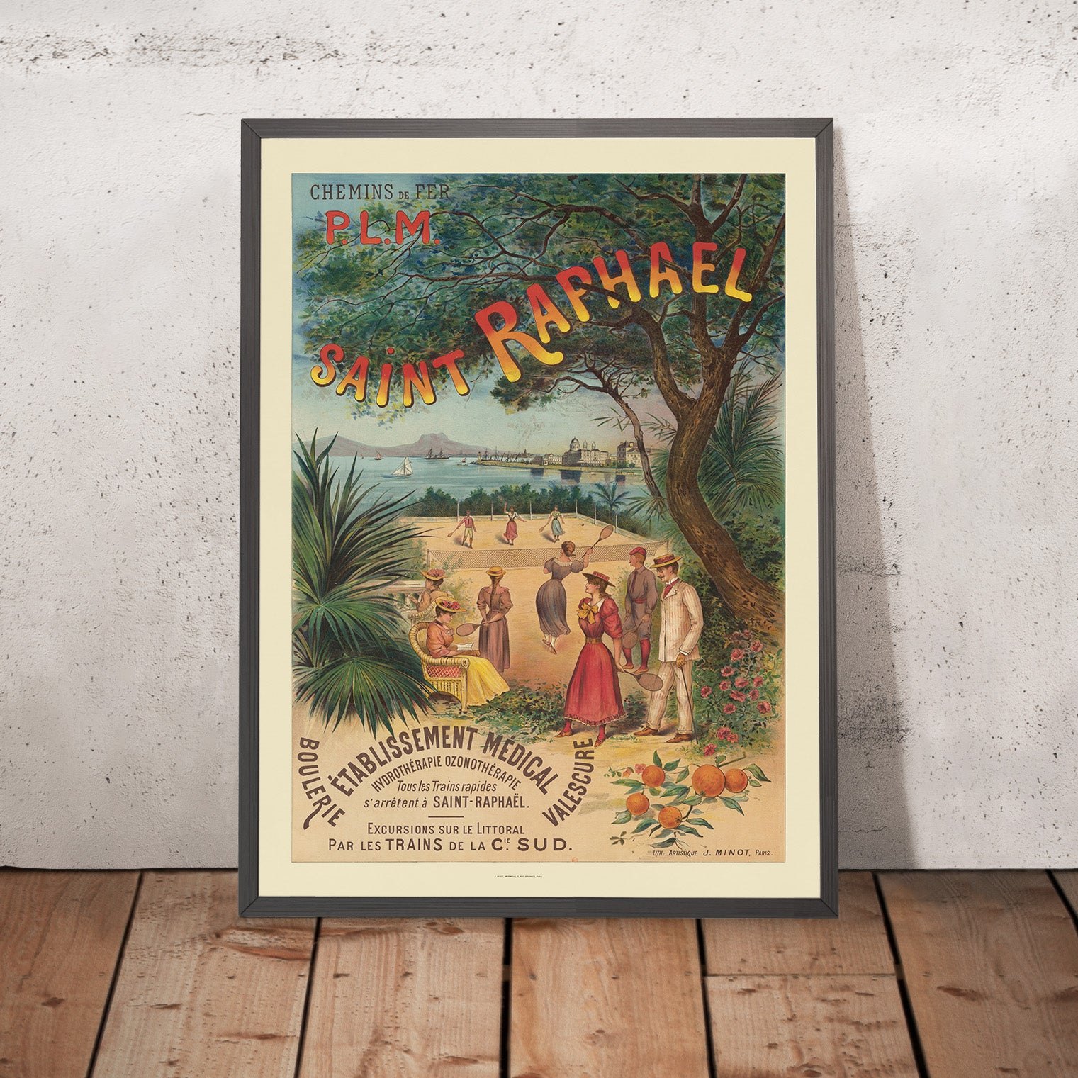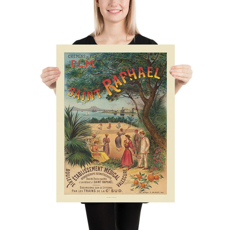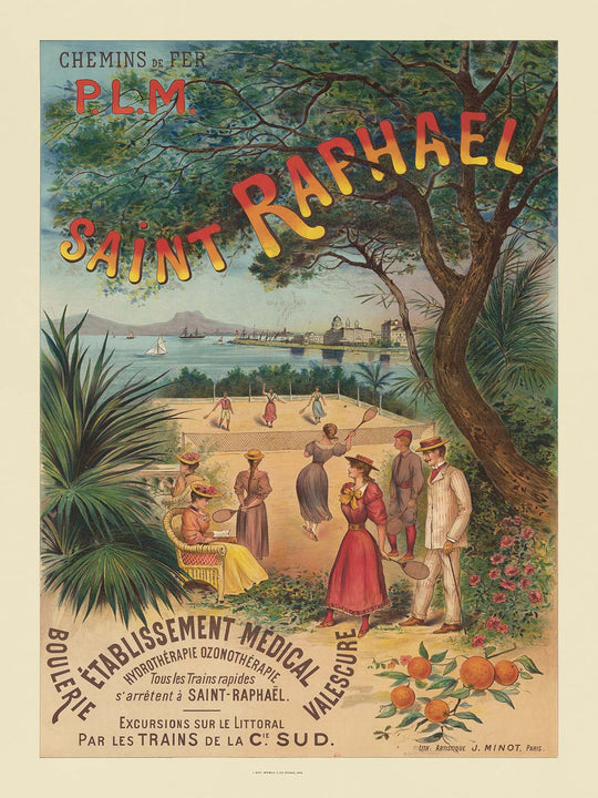 Chemins de fer P.L.M. Paris – Lyon – Méditerranée Saint‑Raphaël by Imp. J. Minot (1893) is a quintessential Belle Époque travel poster celebrating the French Riviera resort of Saint‑Raphaël. Commissioned to entice railway passengers south, it frames a sunlit tennis scene beneath a lacework canopy of pines with the Esterel hills and a promenade of grand hotels beyond. The poster’s big, sun‑washed “SAINT RAPHAEL” lettering arcs across the branches, while below, elegant visitors rally on a seaside court, citrus boughs heavy with oranges (Citrus sinensis) glow at the edge, and white sails stipple the blue bay—an irresistibly romantic snapshot of the Côte d’Azur at the dawn of leisure travel.