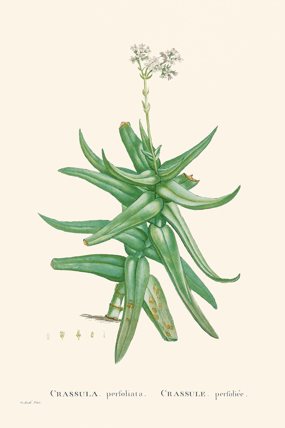 The Sickle-Leaf Red Crassula (Crassula Perfoliata) is a captivating botanical illustration crafted by the renowned Pierre-Joseph Redouté in 1802. As one of the greatest botanical illustrators in history, Redouté's work is celebrated for its precision and beauty. This particular piece, with its delicate rendering of the Crassula Perfoliata, embodies the elegant botanical tradition that thrived during the Victorian era.
