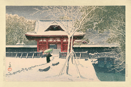"Snow in Shiba Park," created by the legendary Japanese artist Hasui Kawase in 1935, is a remarkable woodblock print that celebrates the serene beauty of winter. Known for his skillful integration of Western and traditional Japanese art styles, Kawase's work captures the quiet, snow-laden charm of Shiba Park in Tokyo, bringing to life the ethereal qualities of falling snow over the tranquil landscape.
