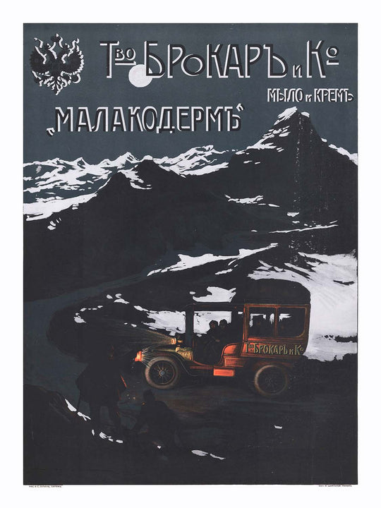 Louis Tauzin’s 1909 Entreprise Brokar & Cie – Savon et crème – ‘Malakoderm’ is a dramatic Belle Époque advertising poster with the soul of a travel scene. In moonlit blues and inky blacks, a jagged Alpine peak rises above a serpentine mountain road as a red touring car rounds the bend—its headlamps throwing a warm cone of light onto two shadowy figures at the roadside. Cyrillic lettering and the double‑headed imperial eagle identify the Russian perfumery Brokar & Co., while the product name “Малакодермъ” (Malakoderm—literally “soft skin”) glows across the night sky. The setting, with its unmistakably pyramidal summit, closely recalls the Matterhorn above Zermatt, evoking the romance of early travel in the high Alps.