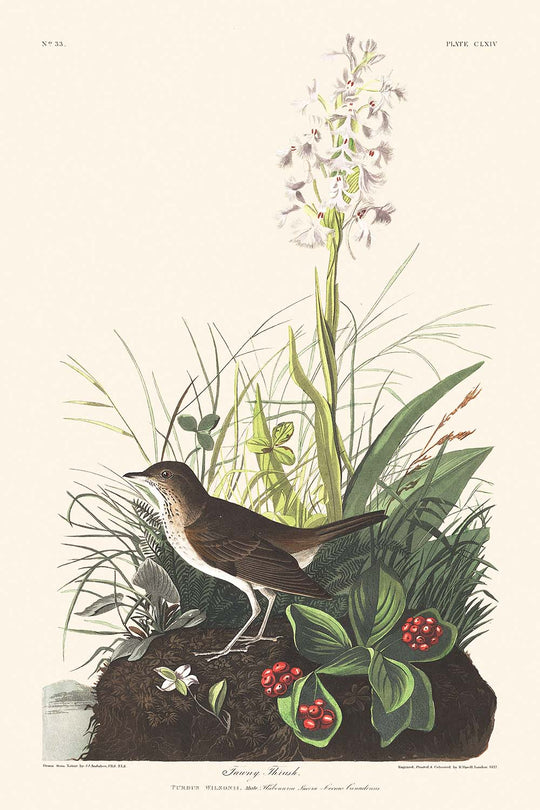 The "Tawny Thrush" illustration is not only a visual delight but also an informative piece, symbolizing Audubon's invaluable contributions to zoological and botanical documentation of his time. The serene yet intricate design and scholarly interest make it a cherished acquisition for ornithology enthusiasts and art lovers alike.