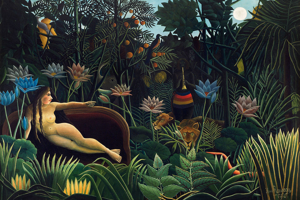Henri Rousseau (1844-1910) was a self-taught French Post-Impressionist painter acclaimed for his distinctive style and imaginative landscapes. Despite his lack of formal training, Rousseau's works are celebrated for their naive yet evocative quality. "The Dream" stands as one of his final masterpieces, blending realism with fantasy, and showcases Rousseau’s fascination with the exotic environments that he could only dream of.