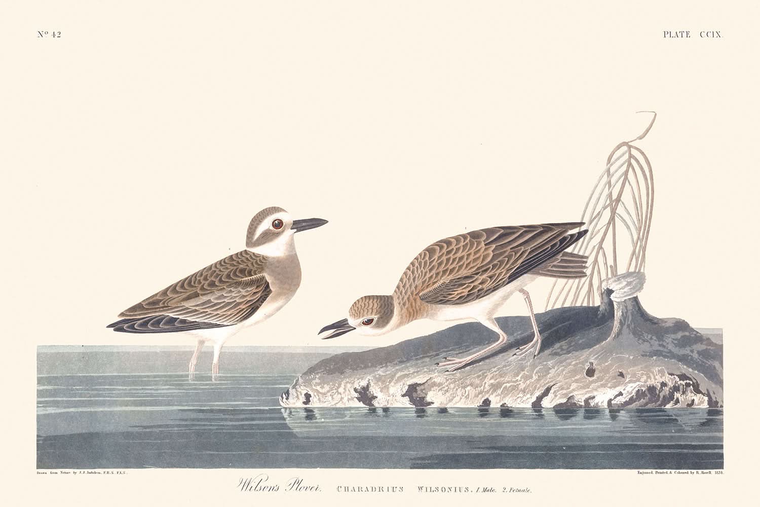 John James Audubon's "Wilson's Plover" (Plate 209) offers a timeless exploration into the world of avians, presented with unparalleled beauty and detail. First introduced to the world in 1827 as part of Audubon's renowned series, Birds of America, this illustration captures the soft greys and whites of the Wilson's Plover, a bird forever enchanting coastal environments from South Carolina to Florida and beyond.