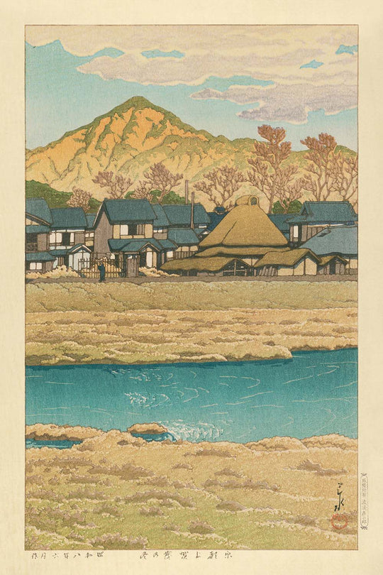 Hasui Kawase is celebrated for his contemplative landscapes that capture the essence of Japanese nature with subtlety and refined elegance. Winter in Kamigamo, Kyoto is notable for its tranquil depiction of snowy rooftops and a serene setting under pale blue skies, capturing the quiet beauty of winter. This work exemplifies Kawase’s skillful balance of color and composition, with a predominance of soft beige tones complemented by cooling blues, evoking the crisp and calming atmosphere of a winter day.