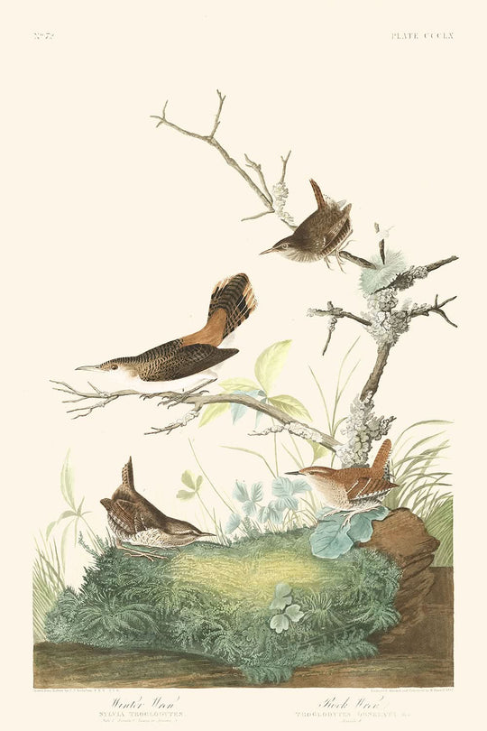 Audubon's notability as a naturalist and artist lies in his profound ability to bring the natural world to life on paper. His portrayal of the Winter Wren and Rock Wren is particularly notable for its depiction of not only their physical plumage but also their spirited behavior and environment. The Winter Wren, a species renowned for its extraordinary migratory patterns, is depicted with finely detailed feathers and a lively posture, capturing their restless nature. The Rock Wren, equally animated, joins this harmonious duet, illustrating the artist’s keen eye for ornithological accuracy and detail.