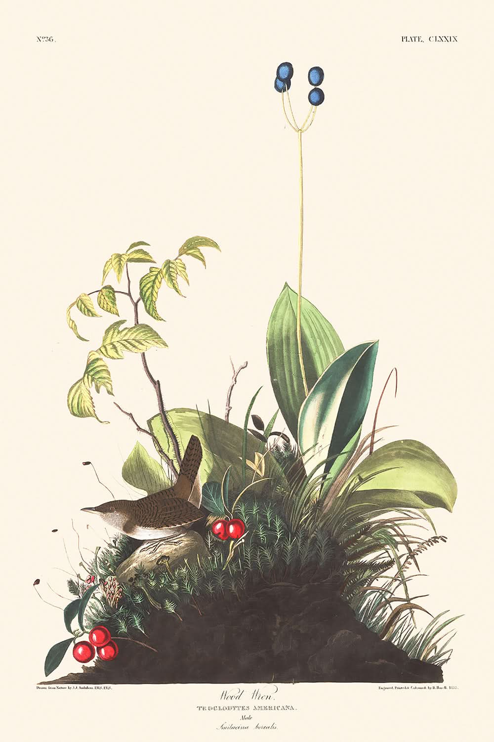 The Wood Wren illustration is notable not only for its historical release year but for the insight it provides into previously undocumented aspects of the species, such as its distinctive nesting habits and the unique coloration of its eggs. The artwork evokes a profound connection to the avian world of the 19th century, underscored by Audubon's firsthand descriptions of the wren's behavioral patterns.
