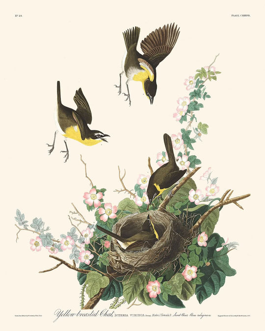 The "Yellow-breasted Chat" illustration, first published in 1827 by the renowned ornithologist John James Audubon, captures the vibrant essence of this singular bird, known scientifically as Icteria viridis, within his famed collection, "Birds of America." This illustrative work reflects Audubon's deep observational study and artistic prowess, depicting the Yellow-breasted Chat in its strikingly beautiful plumage as it traverses the tangled thickets and brier patches of Louisiana and the Carolinas.