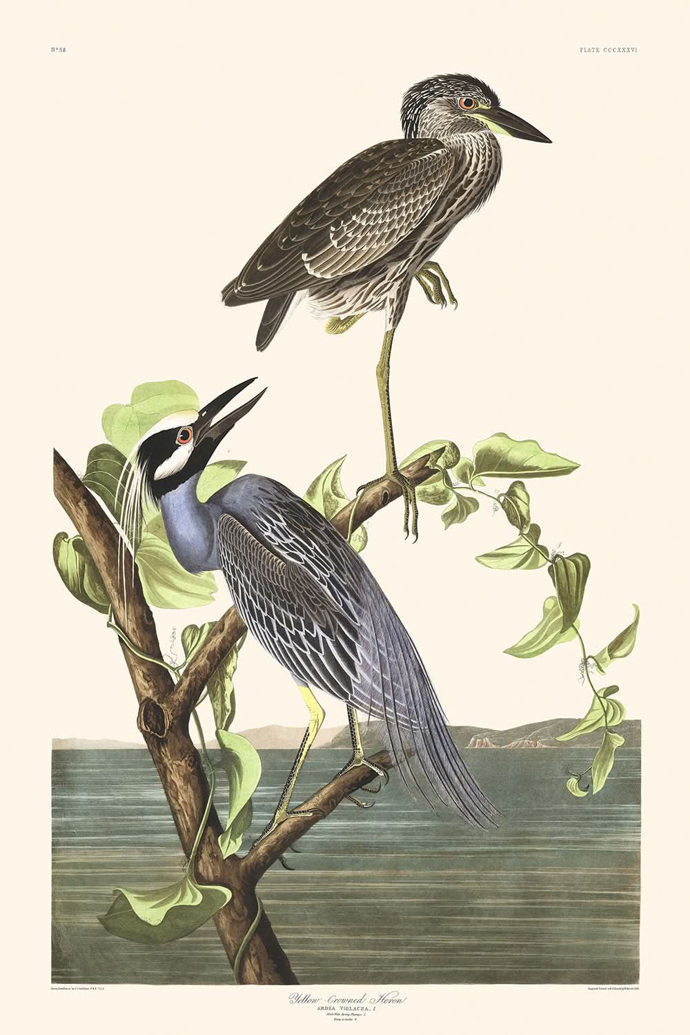 Yellow-Crowned Heron by John James Audubon, first published in 1827, is a captivating example of Audubon's extraordinary ability to bring the intricate beauty of birds to life through his illustrations. This piece is part of his magnum opus, "The Birds of America," which is celebrated for its majestic portrayals of avian species, captured in remarkable detail.
