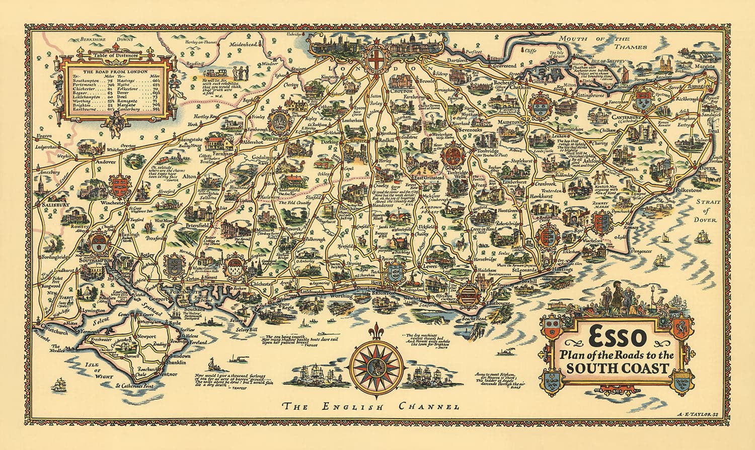 This rather fascinating pictorial map of Southeast England was created by A.E. Taylor and published in 1931 by Esso - which was known as Standard Oil in the US and only a few months previous as Pratts Oil in the UK.