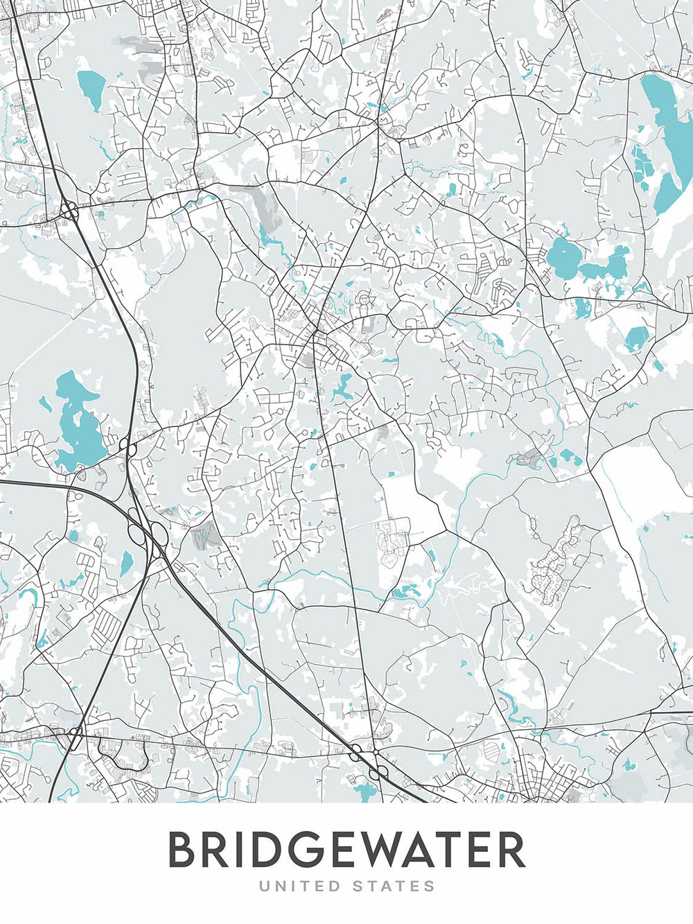 This Bridgewater map is a celebration of modern cartography and design. With its clean lines and muted colors, this map will add a touch of sophistication to any home or office. The map focuses on the city of Bridgewater in Massachusetts, and extends approximately 9 miles to the north of the city center, 9 miles to the south, 7.5 miles to the east, and 7.5 miles to the west. This encompasses the entirety of the city of Bridgewater, as well as portions of the neighboring towns of Raynham, Easton, Whitman, Brockton, and Halifax.