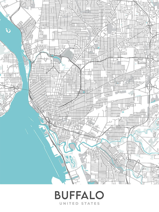 This map of Buffalo, New York, is a modern, detailed street map without labels. It focuses on the city of Buffalo and its surrounding areas, providing an accurate and visually appealing representation of the city's layout. The map covers a wide range of neighborhoods, including Allentown, Black Rock, Elmwood Village, and North Buffalo, each with its own unique character and charm.