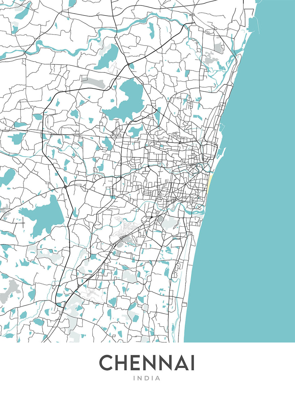 Beyond its visual appeal, this map encapsulates the dynamic spirit of Chennai. Highlighting key areas like the educational hub of Guindy, the historical richness of Fort St. George, and the natural beauty of Marina Beach, it brings the city’s landmarks into your home. The map’s detailed depiction of Chennai’s rivers, such as the Cooum and Adyar, and its coastal line along the Bay of Bengal, add a geographical charm that blends seamlessly with the urban design.