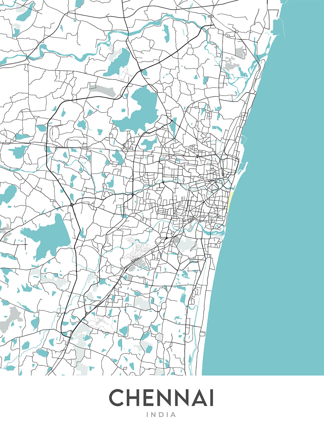 Immerse yourself in the bustling metropolis of Chennai with this stunning map by The Unique Maps Co. This modern, meticulously detailed street map offers a fresh perspective on one of India's most vibrant cities. With its clean lines and absence of labels, the map invites you to explore the intricate network of streets that lace through Chennai’s diverse neighborhoods. From the cultural hub of Mylapore to the commercial dynamism of T. Nagar, and from the serene beachside of Besant Nagar to the upscale enclaves of Anna Nagar, this map captures the essence of Chennai's varied urban landscape.